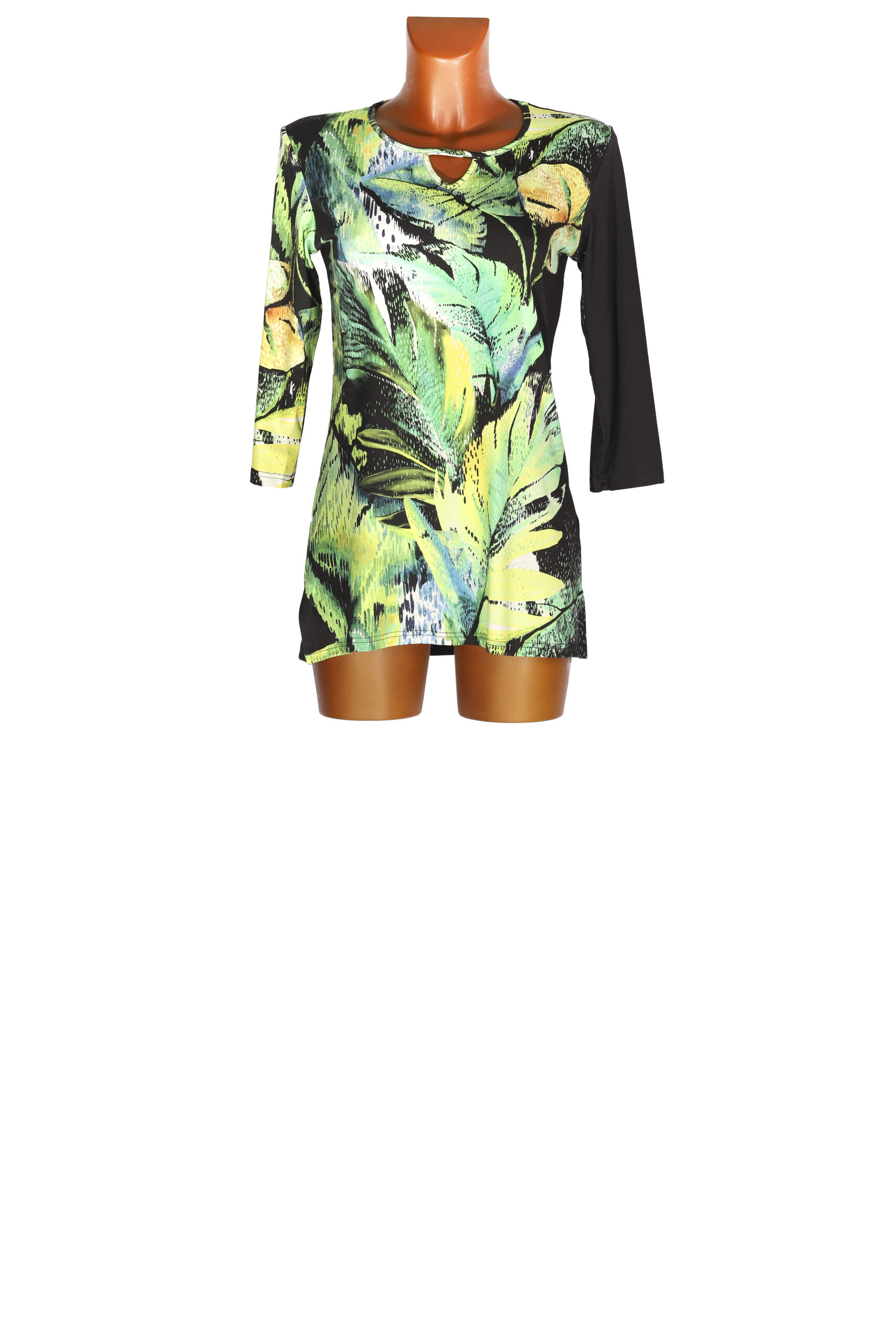 Dámská halena rovného střihu, s rozparky, 3/4 rukávem a zajímavě řešeným výstřihem.