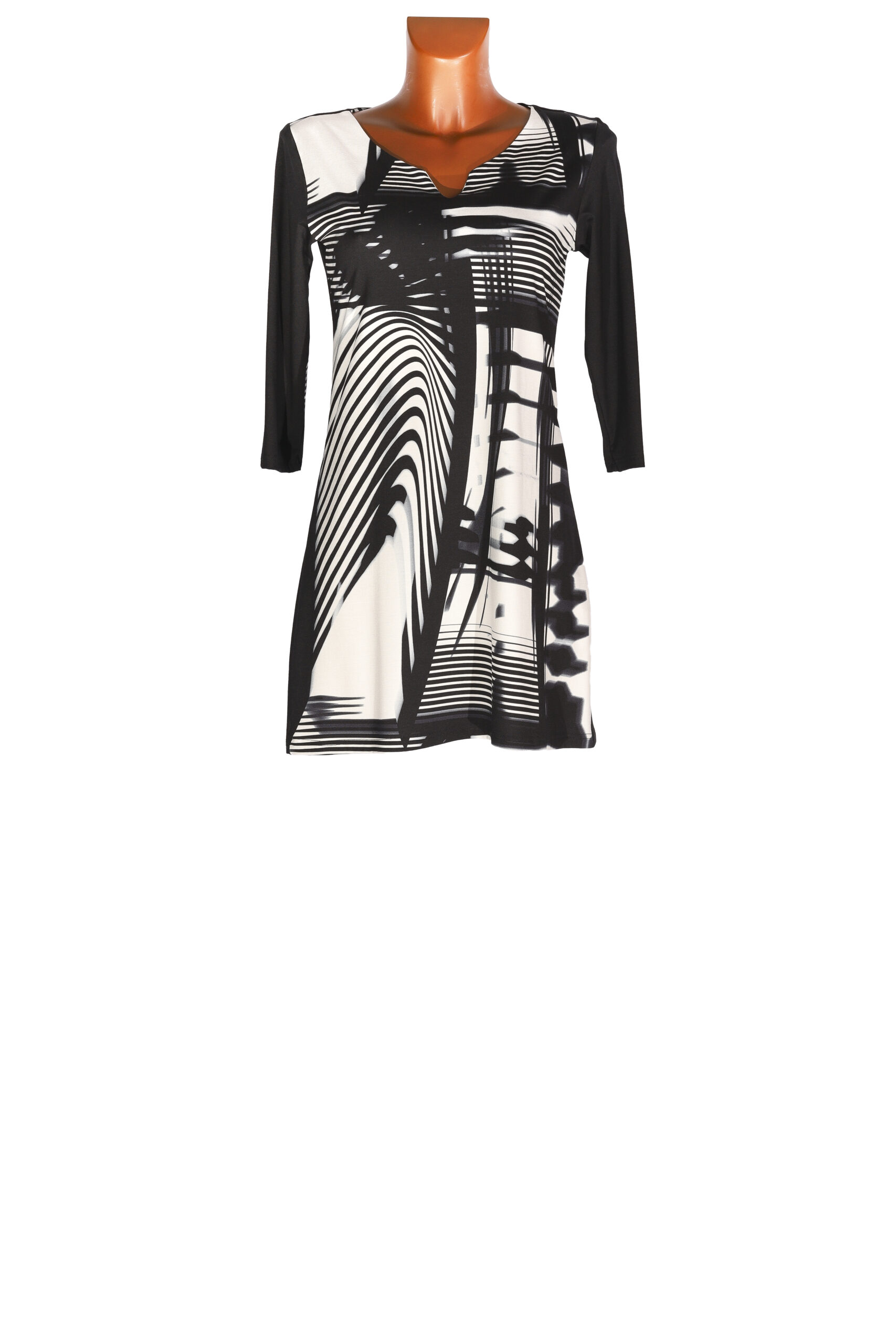 Dámská pouzdrová tunika s 3/4 rukávem, na zadním dílu záševky, výstřih s podložením do „V“. Zadní díl v černé barvě. Doporučujeme zvolit o číslo větší, než je Vaše běžná konfekční velikost.