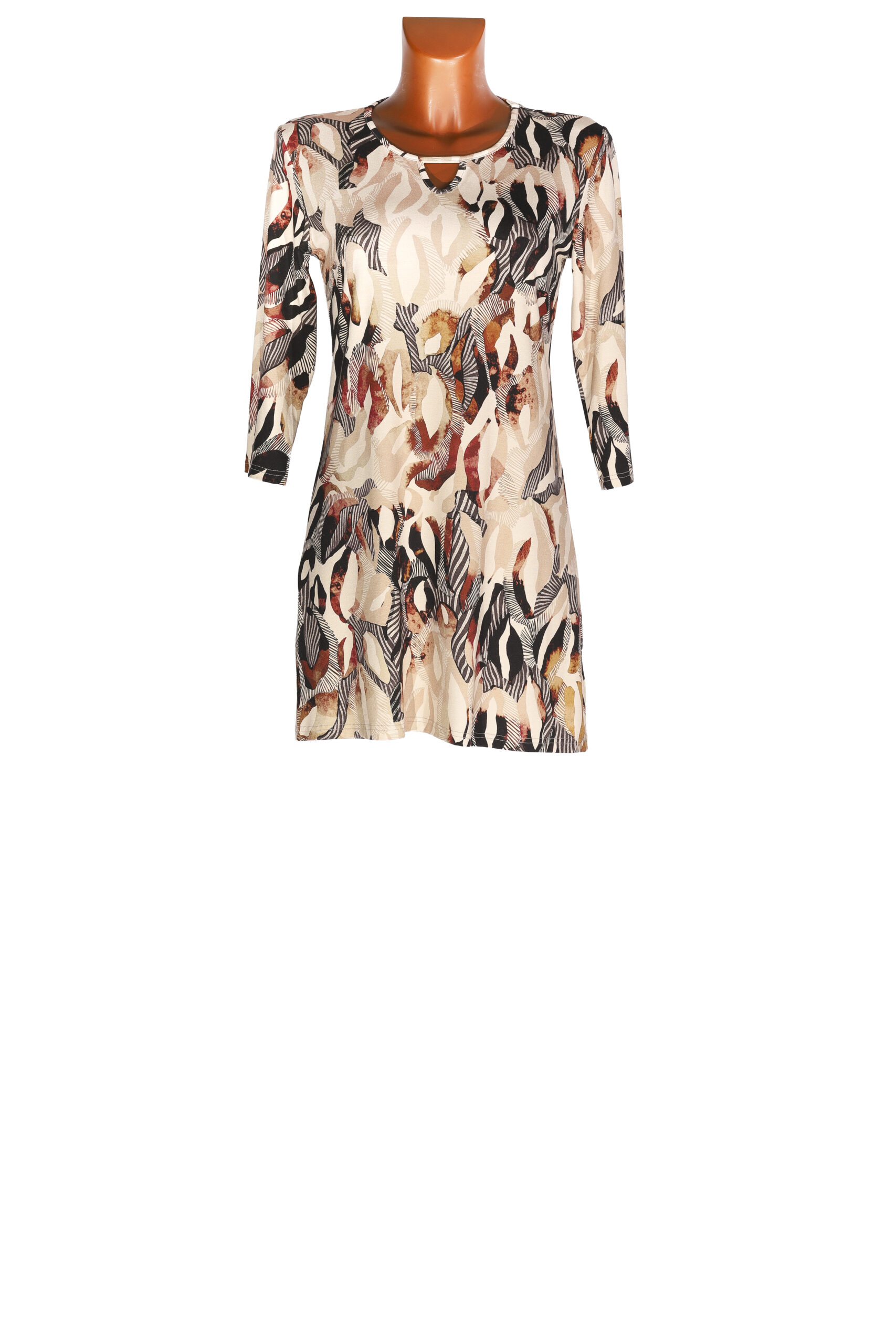 Dámská pouzdrová tunika s 3/4 rukávem a zajímavě řešeným výstřihem. Doporučujeme zvolit o číslo větší, než je Vaše běžná konfekční velikost.